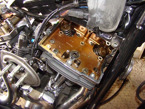 Monday 31st March 2008 The bike came apart really easily and the whole thing took about 2 hours. There was some obvious wear on the barrels and a bit on the pistons and rings. The next thing to do is to remove the valves and see if there's any wear there. That is due to take place tomorrow. It may be necessary to have the pistons and bore checked to see if just a hone and new rings will do the job.